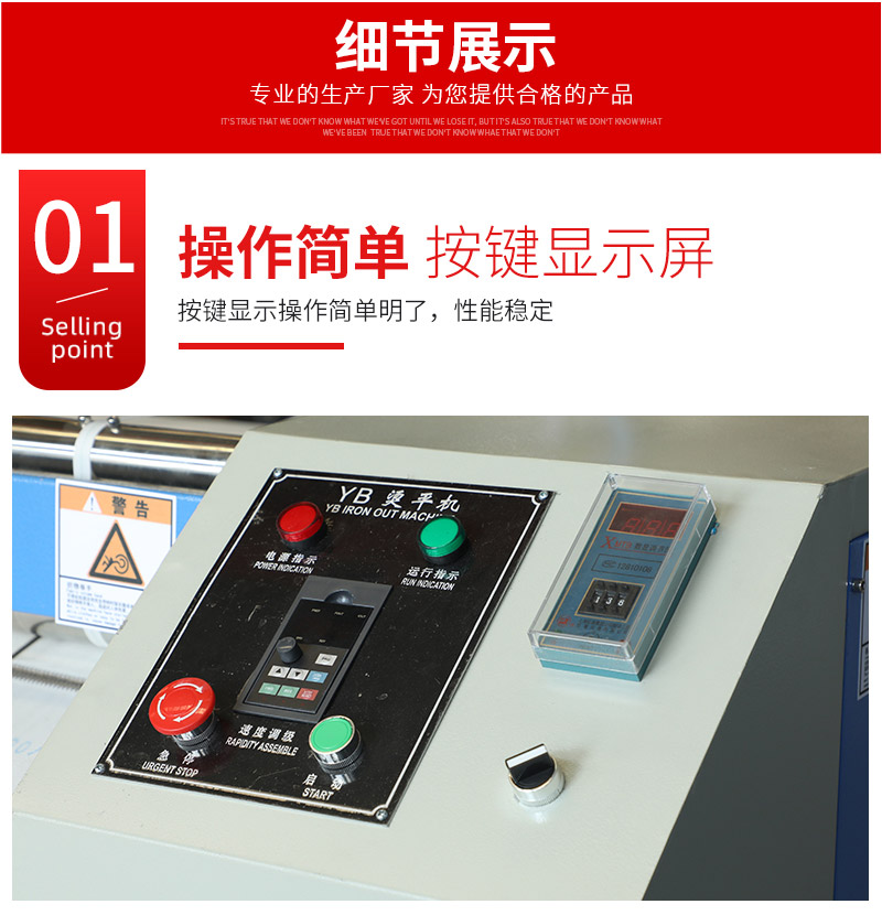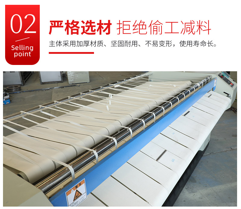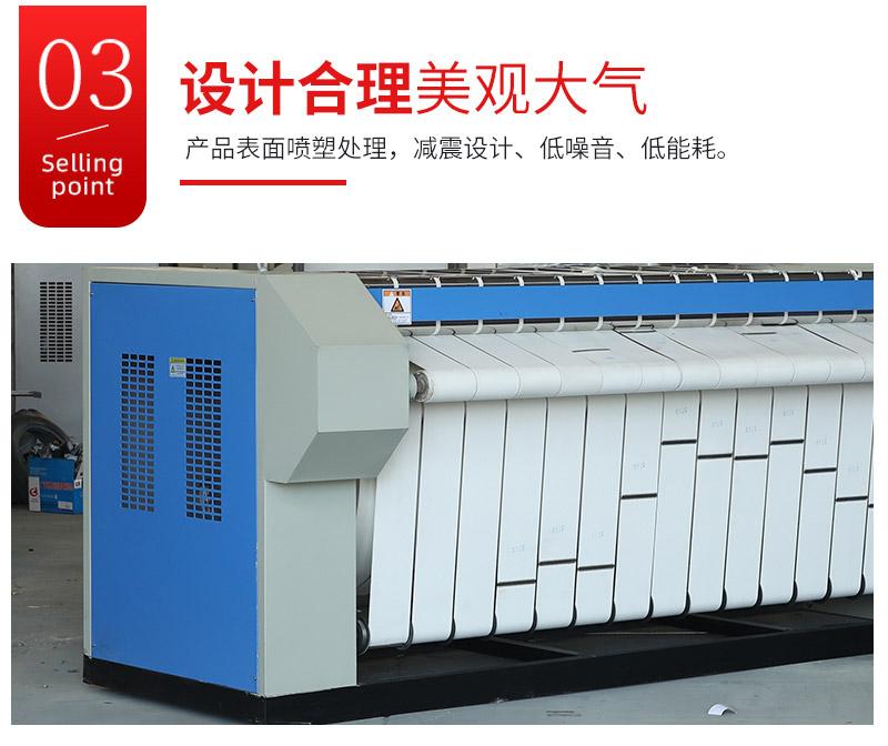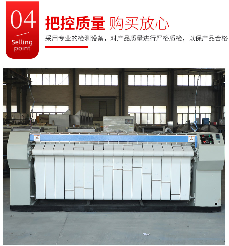 YP系列滾筒燙平機具有結構簡便合理,熨燙幅度大,能耗低,性能安全可靠等優(yōu)點。無級變速,用戶可根據(jù)不同織物的需要及熨平狀況選取適合的熨燙速度。物料輸送系統(tǒng)采用優(yōu)質(zhì)定型寬錠帶,避免了寬幅帆布在傳送中難于解決的游動現(xiàn)象。烘筒采用優(yōu)質(zhì)不銹鋼精致而成,具有加快、防腐蝕、織物易干易平等優(yōu)點。有三種加熱方式可選:蒸汽加熱、電加熱、燃氣加熱。